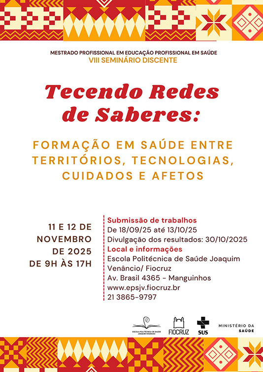 A proposta do tema “Tecendo Redes de Saberes” busca promover a reflexão crítica, a socialização de conhecimentos e o intercâmbio entre diferentes níveis de formação, articulando territórios, tecnologias, cuidados e afetos em diálogo com uma formação crítica, politécnica e voltada à transformação social. O evento é aberto à discentes e egressas/os do Mestrado Profissional em Educação Profissional em Saúde (EPSJV/FIOCRUZ), estudantes de outros programas de pós-graduação e graduação, além de alunas/os de nível médio técnico em saúde, profissionais, pesquisadoras/es, docentes, representantes/integrantes dos movimentos sociais e aos demais interessadas/os.
